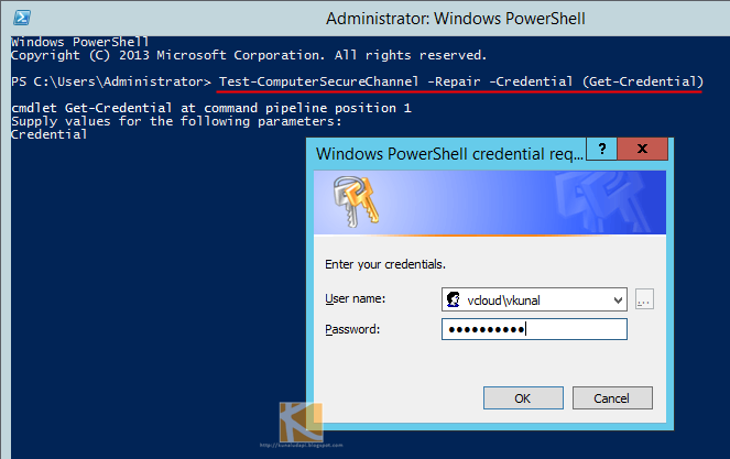Test computersecurechannel is one of those cool little powershell cmdlets that doesn t get the recognition it deserves. Once powershell is fired up you have to just run below command to rejoin computer into domain without restart. Test computersecurechannel repair credential get credential when the above command is executed it will prompt for username and password and enter the domain credentials and result should show as true then the machine is re added to domain.